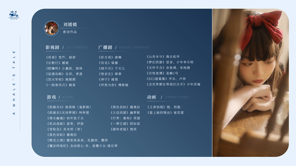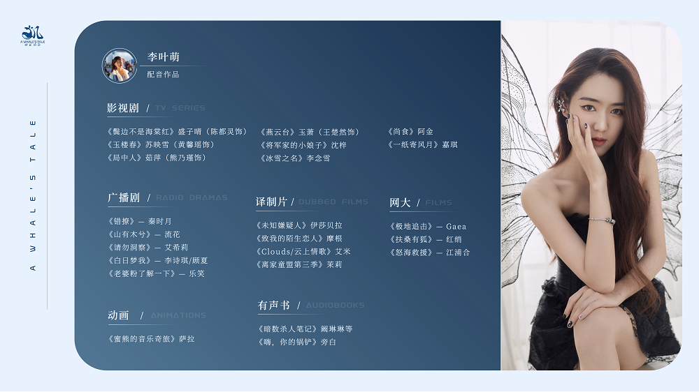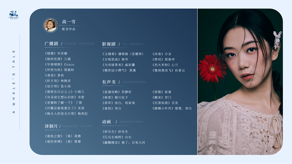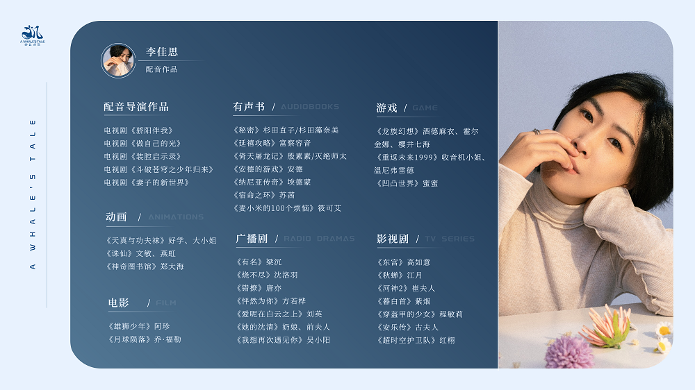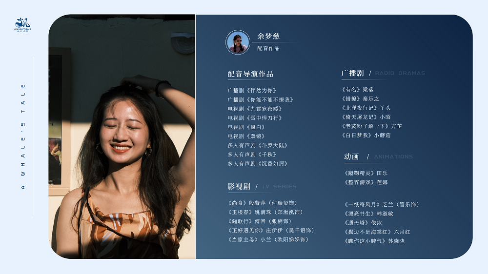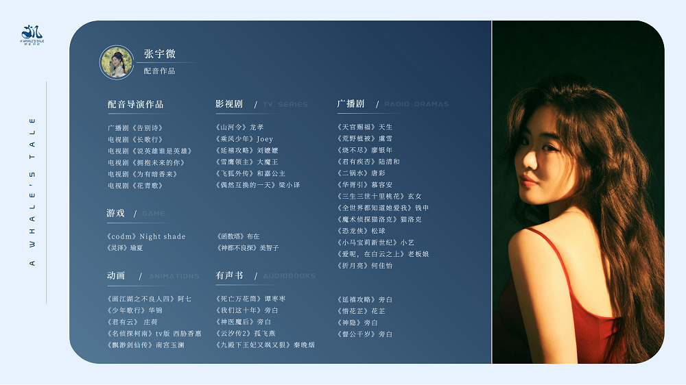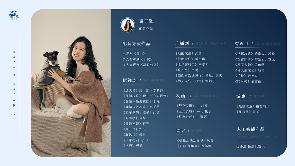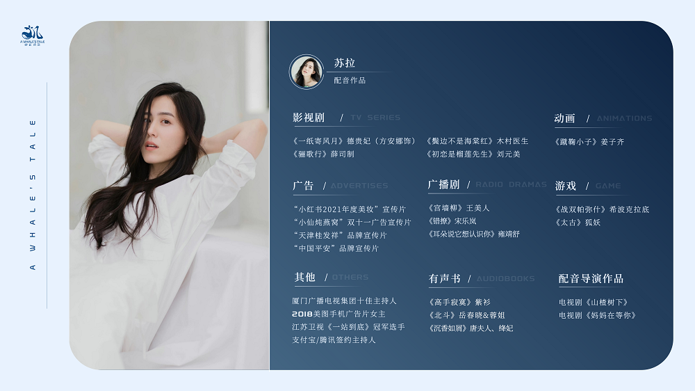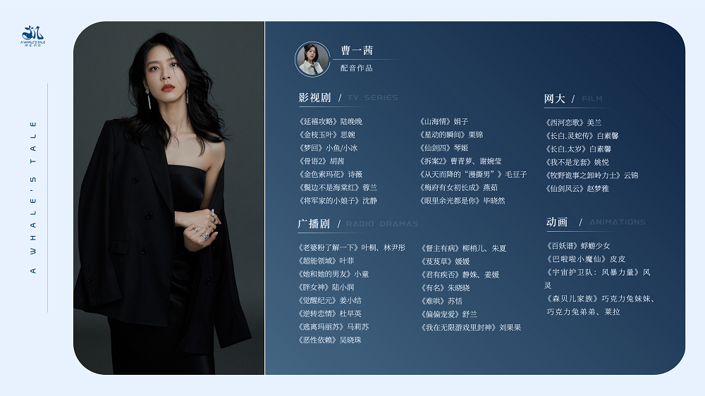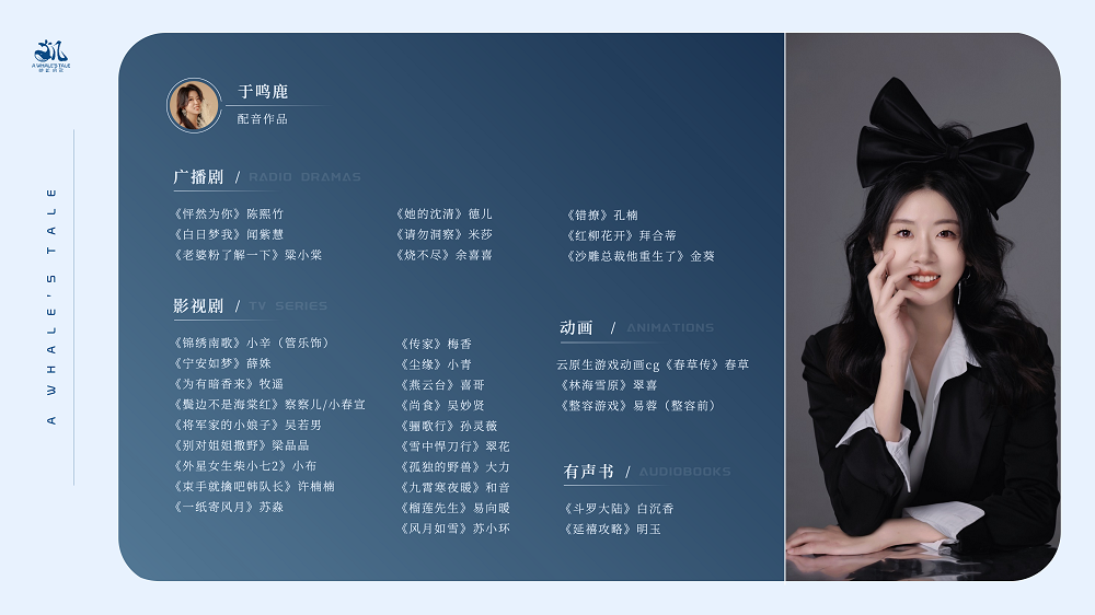 1996年进入配音行业,迄今为止,已参与过数百部影视作品的配音、配音导演工作,塑造了诸多观众喜爱的经典角色。2010年,把工作重心转移到了更具挑战性的配音导演上,并先后执导了《伪装者》、《延禧攻略》、《鬓边不是海棠红》、《雪中悍刀行》等大热影视剧的配音。无论是做配音演员还是配音导演,“以戏为先,以角色为先,用心专注每一部作品”一直是她奉行的理念。她对作品细腻的理解,以及对角色精准的把控,获得了业内外的一致好评。